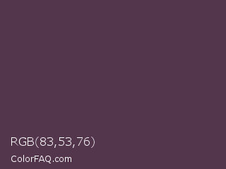RGB 83,53,76 Color is a dark magenta color and the nearest color is Voodoo #533455. Hex code #53354c and RGB value is rgb(83,53,76). In RGB color space, this color is composed of 33% red, 21% green, 30% blue, In CMYK color space, this color is composed of 0% cyan, 36% magenta, 8% yellow , 67% black , In HSL color space, this color has a hue angle of 314° , 22% saturation and 27% lightness.