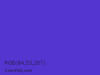 RGB 84,53,207 Color is a normal indigo color and the nearest color is Purple Heart Crayola #652dc1. Hex code #5435cf and RGB value is rgb(84,53,207). In RGB color space, this color is composed of 33% red, 21% green, 81% blue, In CMYK color space, this color is composed of 59% cyan, 74% magenta, 0% yellow , 19% black , In HSL color space, this color has a hue angle of 252° , 62% saturation and 51% lightness.