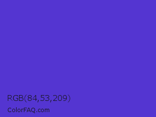 RGB 84,53,209 Color is a normal indigo color and the nearest color is Purple Heart Crayola #652dc1. Hex code #5435d1 and RGB value is rgb(84,53,209). In RGB color space, this color is composed of 33% red, 21% green, 82% blue, In CMYK color space, this color is composed of 60% cyan, 75% magenta, 0% yellow , 18% black , In HSL color space, this color has a hue angle of 252° , 63% saturation and 51% lightness.