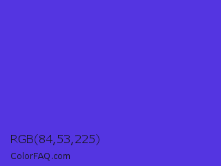 RGB 84,53,225 Color is a normal indigo color and the nearest color is Majorelle Blue #6050dc. Hex code #5435e1 and RGB value is rgb(84,53,225). In RGB color space, this color is composed of 33% red, 21% green, 88% blue, In CMYK color space, this color is composed of 63% cyan, 76% magenta, 0% yellow , 12% black , In HSL color space, this color has a hue angle of 251° , 74% saturation and 55% lightness.