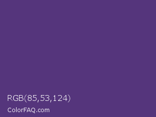 RGB 85,53,124 Color is a normal violet color and the nearest color is Regalia #522d80. Hex code #55357c and RGB value is rgb(85,53,124). In RGB color space, this color is composed of 33% red, 21% green, 49% blue, In CMYK color space, this color is composed of 31% cyan, 57% magenta, 0% yellow , 51% black , In HSL color space, this color has a hue angle of 267° , 40% saturation and 35% lightness.
