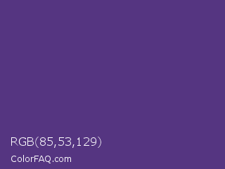 RGB 85,53,129 Color is a normal violet color and the nearest color is Regalia #522d80. Hex code #553581 and RGB value is rgb(85,53,129). In RGB color space, this color is composed of 33% red, 21% green, 51% blue, In CMYK color space, this color is composed of 34% cyan, 59% magenta, 0% yellow , 49% black , In HSL color space, this color has a hue angle of 265° , 42% saturation and 36% lightness.