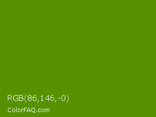 RGB 86,146,-0 Color is a dark green color and the nearest color is Avocado #568203. Hex code #569200 and RGB value is rgb(86,146,-0). In RGB color space, this color is composed of 34% red, 57% green, 0% blue, In CMYK color space, this color is composed of 41% cyan, 0% magenta, 100% yellow , 43% black , In HSL color space, this color has a hue angle of 85° , 100% saturation and 29% lightness.