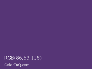 RGB 86,53,118 Color is a normal violet color and the nearest color is Regalia #522d80. Hex code #563576 and RGB value is rgb(86,53,118). In RGB color space, this color is composed of 34% red, 21% green, 46% blue, In CMYK color space, this color is composed of 27% cyan, 55% magenta, 0% yellow , 54% black , In HSL color space, this color has a hue angle of 270° , 38% saturation and 34% lightness.