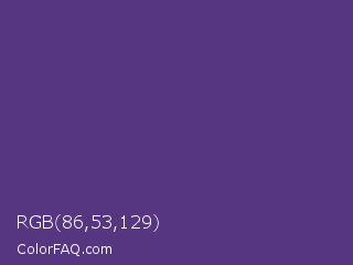 RGB 86,53,129 Color is a normal violet color and the nearest color is Regalia #522d80. Hex code #563581 and RGB value is rgb(86,53,129). In RGB color space, this color is composed of 34% red, 21% green, 51% blue, In CMYK color space, this color is composed of 33% cyan, 59% magenta, 0% yellow , 49% black , In HSL color space, this color has a hue angle of 266° , 42% saturation and 36% lightness.