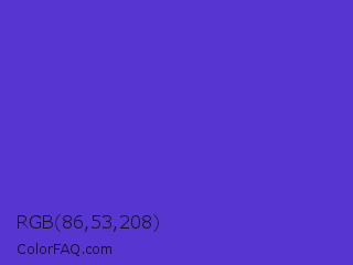 RGB 86,53,208 Color is a normal indigo color and the nearest color is Purple Heart Crayola #652dc1. Hex code #5635d0 and RGB value is rgb(86,53,208). In RGB color space, this color is composed of 34% red, 21% green, 82% blue, In CMYK color space, this color is composed of 59% cyan, 75% magenta, 0% yellow , 18% black , In HSL color space, this color has a hue angle of 253° , 62% saturation and 51% lightness.