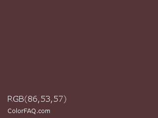 RGB 86,53,57 Color is a dark red color and the nearest color is Congo Brown #593737. Hex code #563539 and RGB value is rgb(86,53,57). In RGB color space, this color is composed of 34% red, 21% green, 22% blue, In CMYK color space, this color is composed of 0% cyan, 38% magenta, 34% yellow , 66% black , In HSL color space, this color has a hue angle of 353° , 24% saturation and 27% lightness.