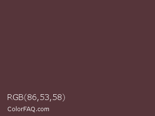 RGB 86,53,58 Color is a dark red color and the nearest color is Congo Brown #593737. Hex code #56353a and RGB value is rgb(86,53,58). In RGB color space, this color is composed of 34% red, 21% green, 23% blue, In CMYK color space, this color is composed of 0% cyan, 38% magenta, 33% yellow , 66% black , In HSL color space, this color has a hue angle of 351° , 24% saturation and 27% lightness.