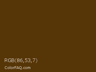 RGB 86,53,7 Color is a very dark orange color and the nearest color is Saddle Brown #583401. Hex code #563507 and RGB value is rgb(86,53,7). In RGB color space, this color is composed of 34% red, 21% green, 3% blue, In CMYK color space, this color is composed of 0% cyan, 38% magenta, 92% yellow , 66% black , In HSL color space, this color has a hue angle of 35° , 85% saturation and 18% lightness.