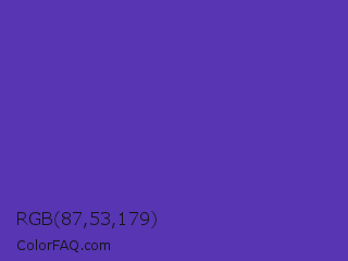 RGB 87,53,179 Color is a normal indigo color and the nearest color is Ocean Blue #4f42b5. Hex code #5735b3 and RGB value is rgb(87,53,179). In RGB color space, this color is composed of 34% red, 21% green, 70% blue, In CMYK color space, this color is composed of 51% cyan, 70% magenta, 0% yellow , 30% black , In HSL color space, this color has a hue angle of 256° , 54% saturation and 45% lightness.