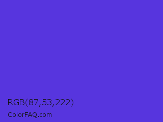RGB 87,53,222 Color is a normal indigo color and the nearest color is Majorelle Blue #6050dc. Hex code #5735de and RGB value is rgb(87,53,222). In RGB color space, this color is composed of 34% red, 21% green, 87% blue, In CMYK color space, this color is composed of 61% cyan, 76% magenta, 0% yellow , 13% black , In HSL color space, this color has a hue angle of 252° , 72% saturation and 54% lightness.