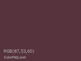 RGB 87,53,60 Color is a dark red color and the nearest color is Congo Brown #593737. Hex code #57353c and RGB value is rgb(87,53,60). In RGB color space, this color is composed of 34% red, 21% green, 24% blue, In CMYK color space, this color is composed of 0% cyan, 39% magenta, 31% yellow , 66% black , In HSL color space, this color has a hue angle of 348° , 24% saturation and 27% lightness.
