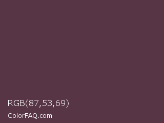 RGB 87,53,69 Color is a dark rose color and the nearest color is Matterhorn #4e3b41. Hex code #573545 and RGB value is rgb(87,53,69). In RGB color space, this color is composed of 34% red, 21% green, 27% blue, In CMYK color space, this color is composed of 0% cyan, 39% magenta, 21% yellow , 66% black , In HSL color space, this color has a hue angle of 332° , 24% saturation and 27% lightness.