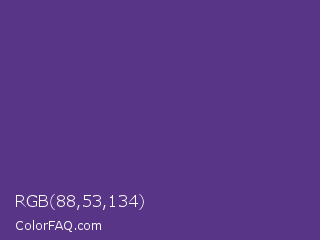 RGB 88,53,134 Color is a normal violet color and the nearest color is Regalia #522d80. Hex code #583586 and RGB value is rgb(88,53,134). In RGB color space, this color is composed of 35% red, 21% green, 53% blue, In CMYK color space, this color is composed of 34% cyan, 60% magenta, 0% yellow , 47% black , In HSL color space, this color has a hue angle of 266° , 43% saturation and 37% lightness.
