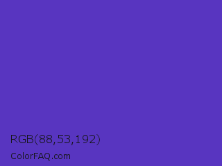 RGB 88,53,192 Color is a normal indigo color and the nearest color is Purple Heart Crayola #652dc1. Hex code #5835c0 and RGB value is rgb(88,53,192). In RGB color space, this color is composed of 35% red, 21% green, 75% blue, In CMYK color space, this color is composed of 54% cyan, 72% magenta, 0% yellow , 25% black , In HSL color space, this color has a hue angle of 255° , 57% saturation and 48% lightness.