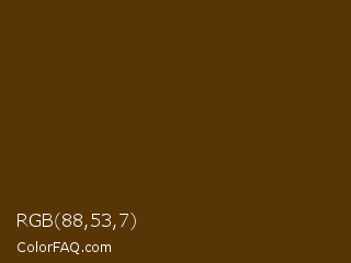 RGB 88,53,7 Color is a very dark orange color and the nearest color is Saddle Brown #583401. Hex code #583507 and RGB value is rgb(88,53,7). In RGB color space, this color is composed of 35% red, 21% green, 3% blue, In CMYK color space, this color is composed of 0% cyan, 40% magenta, 92% yellow , 65% black , In HSL color space, this color has a hue angle of 34° , 85% saturation and 19% lightness.