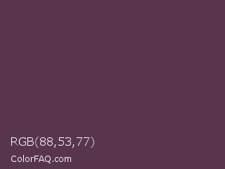 RGB 88,53,77 Color is a dark magenta color and the nearest color is Dark Byzantium #5d3954. Hex code #58354d and RGB value is rgb(88,53,77). In RGB color space, this color is composed of 35% red, 21% green, 30% blue, In CMYK color space, this color is composed of 0% cyan, 40% magenta, 13% yellow , 65% black , In HSL color space, this color has a hue angle of 319° , 25% saturation and 28% lightness.