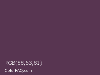 RGB 88,53,81 Color is a dark magenta color and the nearest color is Voodoo #533455. Hex code #583551 and RGB value is rgb(88,53,81). In RGB color space, this color is composed of 35% red, 21% green, 32% blue, In CMYK color space, this color is composed of 0% cyan, 40% magenta, 8% yellow , 65% black , In HSL color space, this color has a hue angle of 312° , 25% saturation and 28% lightness.