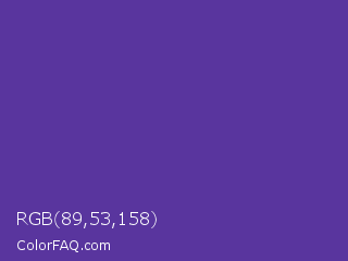 RGB 89,53,158 Color is a normal violet color and the nearest color is Blue Magenta Violet #553592. Hex code #59359e and RGB value is rgb(89,53,158). In RGB color space, this color is composed of 35% red, 21% green, 62% blue, In CMYK color space, this color is composed of 44% cyan, 66% magenta, 0% yellow , 38% black , In HSL color space, this color has a hue angle of 261° , 50% saturation and 41% lightness.