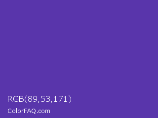 RGB 89,53,171 Color is a normal indigo color and the nearest color is Plump Purple #5946b2. Hex code #5935ab and RGB value is rgb(89,53,171). In RGB color space, this color is composed of 35% red, 21% green, 67% blue, In CMYK color space, this color is composed of 48% cyan, 69% magenta, 0% yellow , 33% black , In HSL color space, this color has a hue angle of 258° , 53% saturation and 44% lightness.