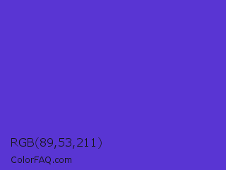 RGB 89,53,211 Color is a normal indigo color and the nearest color is Purple Heart Crayola #652dc1. Hex code #5935d3 and RGB value is rgb(89,53,211). In RGB color space, this color is composed of 35% red, 21% green, 83% blue, In CMYK color space, this color is composed of 58% cyan, 75% magenta, 0% yellow , 17% black , In HSL color space, this color has a hue angle of 254° , 64% saturation and 52% lightness.