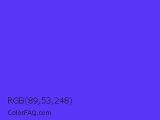 RGB 89,53,248 Color is a normal indigo color and the nearest color is Han Purple #5218fa. Hex code #5935f8 and RGB value is rgb(89,53,248). In RGB color space, this color is composed of 35% red, 21% green, 97% blue, In CMYK color space, this color is composed of 64% cyan, 79% magenta, 0% yellow , 3% black , In HSL color space, this color has a hue angle of 251° , 93% saturation and 59% lightness.