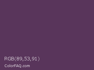 RGB 89,53,91 Color is a dark magenta color and the nearest color is Japanese Violet #5b3256. Hex code #59355b and RGB value is rgb(89,53,91). In RGB color space, this color is composed of 35% red, 21% green, 36% blue, In CMYK color space, this color is composed of 2% cyan, 42% magenta, 0% yellow , 64% black , In HSL color space, this color has a hue angle of 297° , 26% saturation and 28% lightness.