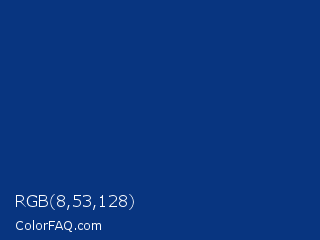 RGB 8,53,128 Color is a dark blue color and the nearest color is Catalina Blue #062a78. Hex code #083580 and RGB value is rgb(8,53,128). In RGB color space, this color is composed of 3% red, 21% green, 50% blue, In CMYK color space, this color is composed of 94% cyan, 59% magenta, 0% yellow , 50% black , In HSL color space, this color has a hue angle of 218° , 88% saturation and 27% lightness.