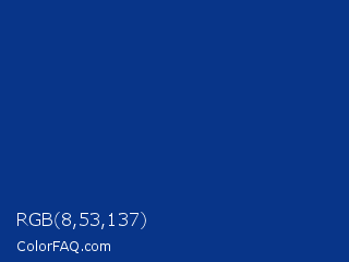RGB 8,53,137 Color is a dark blue color and the nearest color is Air Force Blue USAF #00308f. Hex code #083589 and RGB value is rgb(8,53,137). In RGB color space, this color is composed of 3% red, 21% green, 54% blue, In CMYK color space, this color is composed of 94% cyan, 61% magenta, 0% yellow , 46% black , In HSL color space, this color has a hue angle of 219° , 89% saturation and 28% lightness.
