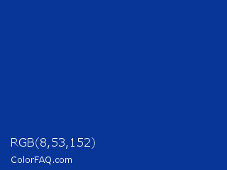 RGB 8,53,152 Color is a normal blue color and the nearest color is Smalt #003399. Hex code #083598 and RGB value is rgb(8,53,152). In RGB color space, this color is composed of 3% red, 21% green, 60% blue, In CMYK color space, this color is composed of 95% cyan, 65% magenta, 0% yellow , 40% black , In HSL color space, this color has a hue angle of 221° , 90% saturation and 31% lightness.