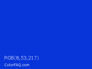 RGB 8,53,217 Color is a normal blue color and the nearest color is Palatinate Blue #273be2. Hex code #0835d9 and RGB value is rgb(8,53,217). In RGB color space, this color is composed of 3% red, 21% green, 85% blue, In CMYK color space, this color is composed of 96% cyan, 76% magenta, 0% yellow , 15% black , In HSL color space, this color has a hue angle of 227° , 93% saturation and 44% lightness.