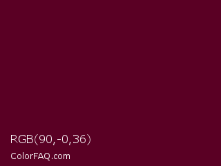 RGB 90,-0,36 Color is a very dark rose color and the nearest color is Bordeaux #5c0120. Hex code #5a0024 and RGB value is rgb(90,-0,36). In RGB color space, this color is composed of 35% red, 0% green, 14% blue, In CMYK color space, this color is composed of 0% cyan, 100% magenta, 60% yellow , 65% black , In HSL color space, this color has a hue angle of 336° , 100% saturation and 18% lightness.