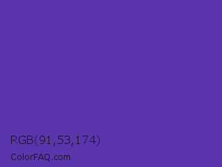 RGB 91,53,174 Color is a normal indigo color and the nearest color is Plump Purple #5946b2. Hex code #5b35ae and RGB value is rgb(91,53,174). In RGB color space, this color is composed of 36% red, 21% green, 68% blue, In CMYK color space, this color is composed of 48% cyan, 70% magenta, 0% yellow , 32% black , In HSL color space, this color has a hue angle of 259° , 53% saturation and 45% lightness.