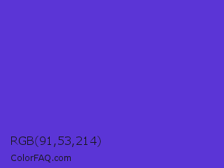 RGB 91,53,214 Color is a normal indigo color and the nearest color is Purple Heart Crayola #652dc1. Hex code #5b35d6 and RGB value is rgb(91,53,214). In RGB color space, this color is composed of 36% red, 21% green, 84% blue, In CMYK color space, this color is composed of 57% cyan, 75% magenta, 0% yellow , 16% black , In HSL color space, this color has a hue angle of 254° , 66% saturation and 52% lightness.