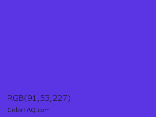 RGB 91,53,227 Color is a normal indigo color and the nearest color is Majorelle Blue #6050dc. Hex code #5b35e3 and RGB value is rgb(91,53,227). In RGB color space, this color is composed of 36% red, 21% green, 89% blue, In CMYK color space, this color is composed of 60% cyan, 77% magenta, 0% yellow , 11% black , In HSL color space, this color has a hue angle of 253° , 76% saturation and 55% lightness.