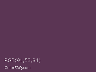 RGB 91,53,84 Color is a dark magenta color and the nearest color is Japanese Violet #5b3256. Hex code #5b3554 and RGB value is rgb(91,53,84). In RGB color space, this color is composed of 36% red, 21% green, 33% blue, In CMYK color space, this color is composed of 0% cyan, 42% magenta, 8% yellow , 64% black , In HSL color space, this color has a hue angle of 311° , 26% saturation and 28% lightness.