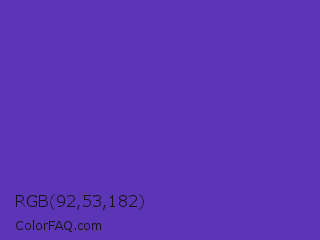 RGB 92,53,182 Color is a normal indigo color and the nearest color is Purple Heart Crayola #652dc1. Hex code #5c35b6 and RGB value is rgb(92,53,182). In RGB color space, this color is composed of 36% red, 21% green, 71% blue, In CMYK color space, this color is composed of 49% cyan, 71% magenta, 0% yellow , 29% black , In HSL color space, this color has a hue angle of 258° , 55% saturation and 46% lightness.
