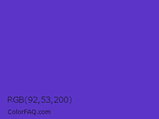 RGB 92,53,200 Color is a normal indigo color and the nearest color is Purple Heart Crayola #652dc1. Hex code #5c35c8 and RGB value is rgb(92,53,200). In RGB color space, this color is composed of 36% red, 21% green, 78% blue, In CMYK color space, this color is composed of 54% cyan, 74% magenta, 0% yellow , 22% black , In HSL color space, this color has a hue angle of 256° , 58% saturation and 50% lightness.