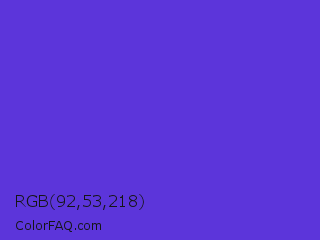 RGB 92,53,218 Color is a normal indigo color and the nearest color is Majorelle Blue #6050dc. Hex code #5c35da and RGB value is rgb(92,53,218). In RGB color space, this color is composed of 36% red, 21% green, 85% blue, In CMYK color space, this color is composed of 58% cyan, 76% magenta, 0% yellow , 15% black , In HSL color space, this color has a hue angle of 254° , 69% saturation and 53% lightness.
