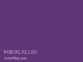 RGB 95,53,120 Color is a normal purple color and the nearest color is Imperial #602f6b. Hex code #5f3578 and RGB value is rgb(95,53,120). In RGB color space, this color is composed of 37% red, 21% green, 47% blue, In CMYK color space, this color is composed of 21% cyan, 56% magenta, 0% yellow , 53% black , In HSL color space, this color has a hue angle of 278° , 39% saturation and 34% lightness.