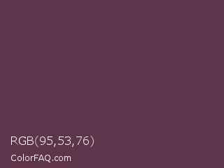 RGB 95,53,76 Color is a dark magenta color and the nearest color is Dark Byzantium #5d3954. Hex code #5f354c and RGB value is rgb(95,53,76). In RGB color space, this color is composed of 37% red, 21% green, 30% blue, In CMYK color space, this color is composed of 0% cyan, 44% magenta, 20% yellow , 63% black , In HSL color space, this color has a hue angle of 327° , 28% saturation and 29% lightness.