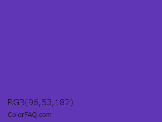 RGB 96,53,182 Color is a normal indigo color and the nearest color is Purple Heart Crayola #652dc1. Hex code #6035b6 and RGB value is rgb(96,53,182). In RGB color space, this color is composed of 38% red, 21% green, 71% blue, In CMYK color space, this color is composed of 47% cyan, 71% magenta, 0% yellow , 29% black , In HSL color space, this color has a hue angle of 260° , 55% saturation and 46% lightness.