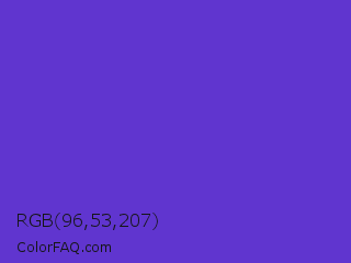 RGB 96,53,207 Color is a normal indigo color and the nearest color is Purple Heart Crayola #652dc1. Hex code #6035cf and RGB value is rgb(96,53,207). In RGB color space, this color is composed of 38% red, 21% green, 81% blue, In CMYK color space, this color is composed of 54% cyan, 74% magenta, 0% yellow , 19% black , In HSL color space, this color has a hue angle of 257° , 62% saturation and 51% lightness.