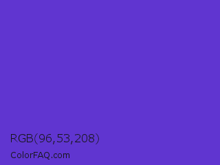 RGB 96,53,208 Color is a normal indigo color and the nearest color is Purple Heart Crayola #652dc1. Hex code #6035d0 and RGB value is rgb(96,53,208). In RGB color space, this color is composed of 38% red, 21% green, 82% blue, In CMYK color space, this color is composed of 54% cyan, 75% magenta, 0% yellow , 18% black , In HSL color space, this color has a hue angle of 257° , 62% saturation and 51% lightness.