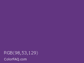 RGB 98,53,129 Color is a normal purple color and the nearest color is Eminence #6c3082. Hex code #623581 and RGB value is rgb(98,53,129). In RGB color space, this color is composed of 38% red, 21% green, 51% blue, In CMYK color space, this color is composed of 24% cyan, 59% magenta, 0% yellow , 49% black , In HSL color space, this color has a hue angle of 276° , 42% saturation and 36% lightness.