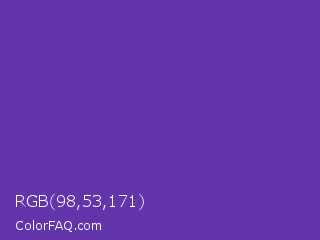 RGB 98,53,171 Color is a normal violet color and the nearest color is Grape #6f2da8. Hex code #6235ab and RGB value is rgb(98,53,171). In RGB color space, this color is composed of 38% red, 21% green, 67% blue, In CMYK color space, this color is composed of 43% cyan, 69% magenta, 0% yellow , 33% black , In HSL color space, this color has a hue angle of 263° , 53% saturation and 44% lightness.
