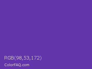 RGB 98,53,172 Color is a normal violet color and the nearest color is Grape #6f2da8. Hex code #6235ac and RGB value is rgb(98,53,172). In RGB color space, this color is composed of 38% red, 21% green, 67% blue, In CMYK color space, this color is composed of 43% cyan, 69% magenta, 0% yellow , 33% black , In HSL color space, this color has a hue angle of 263° , 53% saturation and 44% lightness.