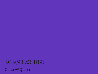 RGB 98,53,189 Color is a normal indigo color and the nearest color is Purple Heart Crayola #652dc1. Hex code #6235bd and RGB value is rgb(98,53,189). In RGB color space, this color is composed of 38% red, 21% green, 74% blue, In CMYK color space, this color is composed of 48% cyan, 72% magenta, 0% yellow , 26% black , In HSL color space, this color has a hue angle of 260° , 56% saturation and 47% lightness.