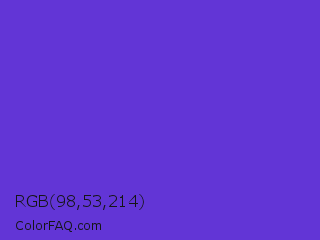 RGB 98,53,214 Color is a normal indigo color and the nearest color is Purple Heart Crayola #652dc1. Hex code #6235d6 and RGB value is rgb(98,53,214). In RGB color space, this color is composed of 38% red, 21% green, 84% blue, In CMYK color space, this color is composed of 54% cyan, 75% magenta, 0% yellow , 16% black , In HSL color space, this color has a hue angle of 257° , 66% saturation and 52% lightness.