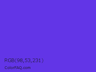 RGB 98,53,231 Color is a normal indigo color and the nearest color is Majorelle Blue #6050dc. Hex code #6235e7 and RGB value is rgb(98,53,231). In RGB color space, this color is composed of 38% red, 21% green, 91% blue, In CMYK color space, this color is composed of 58% cyan, 77% magenta, 0% yellow , 9% black , In HSL color space, this color has a hue angle of 255° , 79% saturation and 56% lightness.